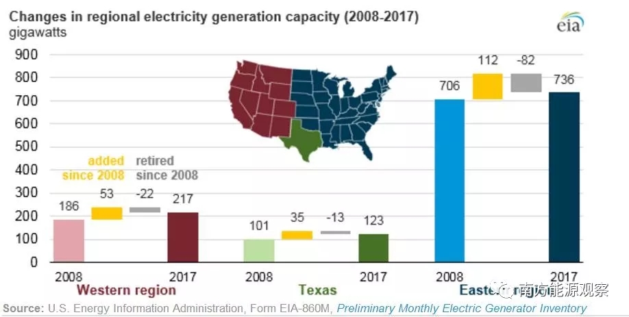 美国西部地区总装机容量约为217GW。San Onofre核电站2号机组和3号机组在2013年退役前为西部地区提供了2.1GW(23%)的发电装机容量。自2008年以来,退役的燃气机组占该地区天然气装机容量的46%。