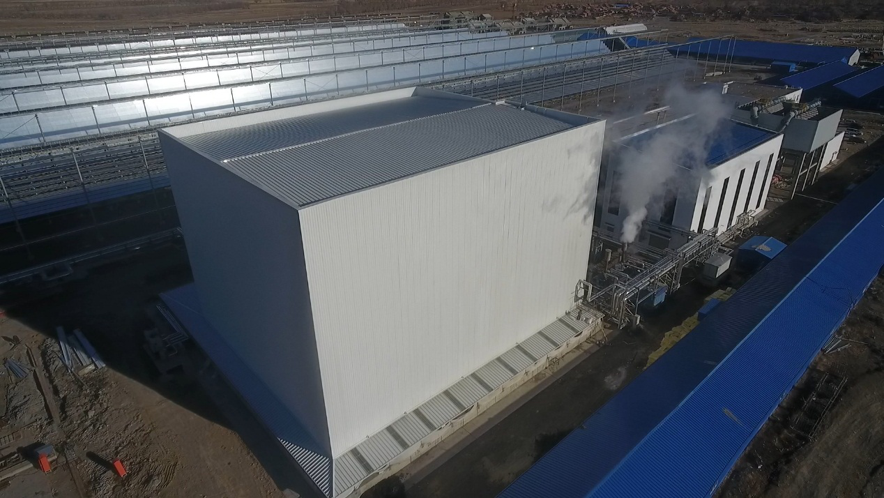 该项目的固态混凝土储热系统虽然总体造价低廉,貌不惊人,却是混凝土储热在全球范围内的首次商业化应用。该储热系统的储热时间为14h,设计压力为16MPA,长期运行条件下最高可耐550摄氏度高温。相比传统熔盐储热系统为维持系统运行而对防止过热及防止凝固所提出的严格要求,混凝土储热系统运行维护安全可靠。经过多年实验验证及第三方权威检测机构验证,完全可以满足光热电站储热系统的设计要求,并可推广至更多热能存储应用领域,发展前景广阔。一号电站实测结果表明,换热性能指标与设计计算结果一致,完全能够满足各种工况条件下的储热、放热工艺需求,标志着兆阳光热混凝土储热技术体系已具备大规模推广条件。