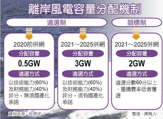 经长沈荣津表示,离岸风场採「先遴选、后竞标」方式选出5.5GW。先遴选出3.5 GW设置量,开发商须经技术能力(60%)跟财务能力(40%)评比排序,在2020年前完工併联者分配0.5GW,2021年至2025年完工併联者分配3GW。