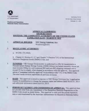 目前在美国运输此类产品之前,都必须获得美国交通部(DOT)PHMSA的特别批准文件后才能进行公路,铁路和海洋运输。然而能够通过并且获得DOT的审批,需要提交复杂的文件和漫长的等待,而最终获得过特别批准的也仅为极少数的美国知名制造商。