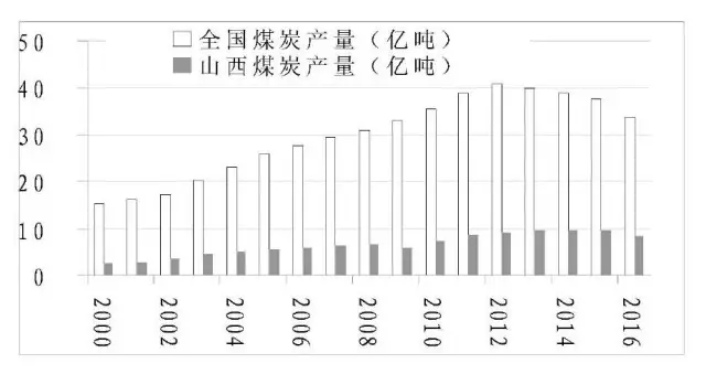 图1 2000年~2016年全国及山西煤炭产量(单位:亿吨)