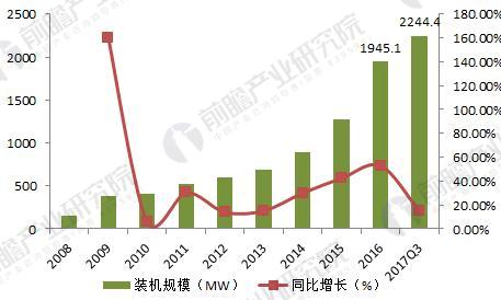 图表2:2008-2017年全球电化学储能项目累计装机规模(单位:MW,%)