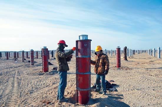 玉门鑫能郑家沙窝5万千瓦熔盐塔式光热发电项目建设现场。该项目总投资17.9亿元,占地2.47平方公里,计划建设总装机容量5万千瓦的熔盐塔式光热电站,建成后,年发电量可达2.02亿千瓦时。