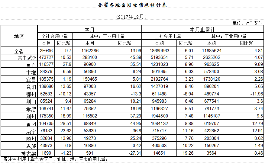 全省14个用电统计地区中,武汉等13个地区全社会用电同比增长,其中咸宁、恩施、神农架林区3地全社会用电增幅在两位数以上。各地工业用电基本与全社会用电同步增长,仅鄂州市受钢铁行业淘汰落后产能影响工业用电下降。“一主两副”城市武汉、宜昌、襄阳3市全社会用电量占到全省的47.16%,工业用电量占全省的44.63%,3市全社会和工业用电均增幅稳健,有力促进了全省用电的增长。