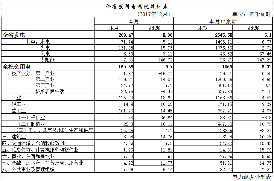 2017年,全省用电需求持续稳定增长,各大产业和城乡居民生活用电全面增长。全省电力战线认真贯彻落实五大发展理念,以确保全省电力供应为中心,以降成本、惠民生为重点,团结协作,克难奋进,确保了全省电网安全稳定运行和电力正常供应,为全省经济社会发展提供了坚强的电力支撑。截止年底,全省全口径装机容量7124.48万千瓦,同比增长5.62%;全年发电量2645.58亿千瓦时,增长6.10%;全社会用电量1869.00亿千瓦时,增长6.01%,其中工业用电量1168.59亿千瓦时,增长4.81%。