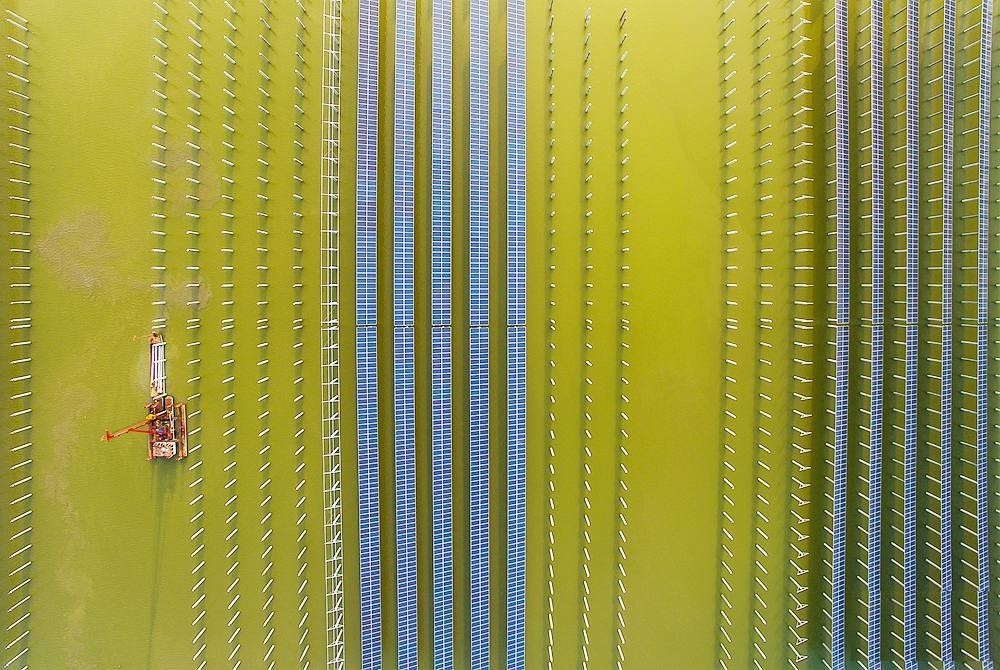 安徽省天长市渔光互补太阳能发电场,上层用于光伏发电,下层用于水产养殖。