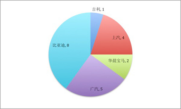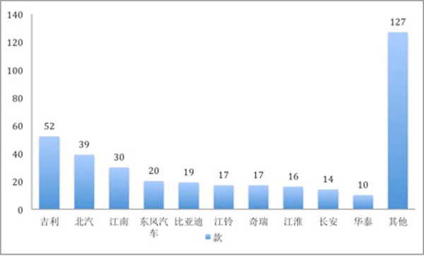 纯电动车型中,吉利以52款进入最多,其次为北汽和江南汽车。插电式车型则被 比亚迪、广汽、华晨宝马、上汽、吉利五家承包,比亚迪以8款位列第一。