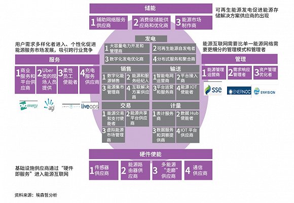 除了传统的电力发、输、配、售、调度外,能源互联网中还出现了六类新玩家:交易、表记数据应用、能源服务、能源管理、能源存储、使能技术。即使是传统价值链中的角色,也细分出了数字化发电优化供应商、分布式能源服务商和能源聚合商等新角色。
