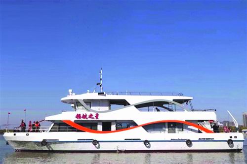 该船为纯电动内河游览船,动力电池采用4组总容量600千瓦时的磷酸铁锂电池,设计总吨位138 吨,定员53人。船长约27米、宽约6米。由两台60千瓦船用永磁同步电机驱动,并配有高效螺旋桨,具有良好的耐波性和操作性,深静水试航速度不小于18千米/小时,船航速12千米/小时,续航力约8小时。