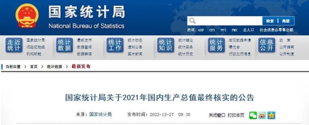12月27日,国家统计局网站发布关于2021年国内生产总值最终核实的公告。