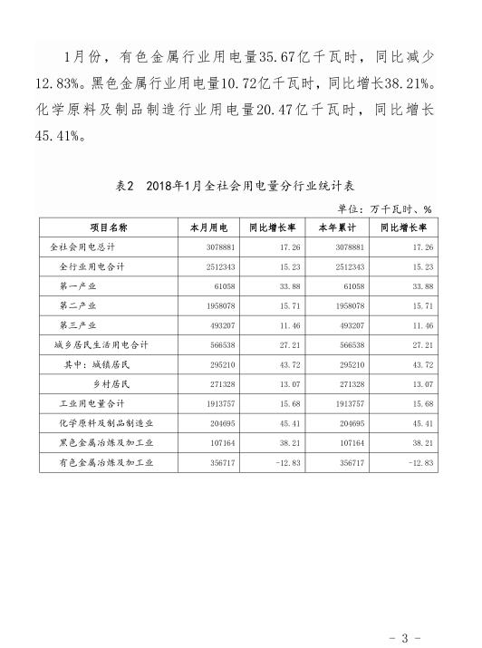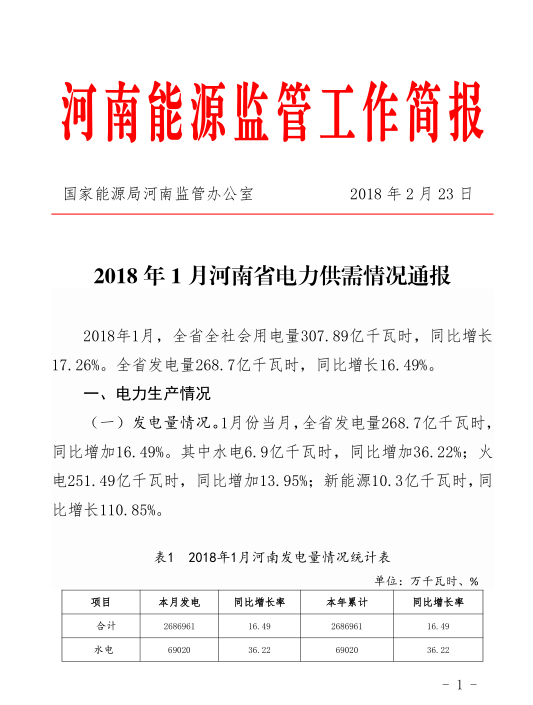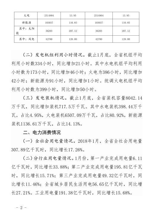 2018年1月,全省全社会用电量307.89亿千瓦时,同比增长17。26%。全省发电量268.7亿千瓦时,同比增长16.49%。以下为具体数据: