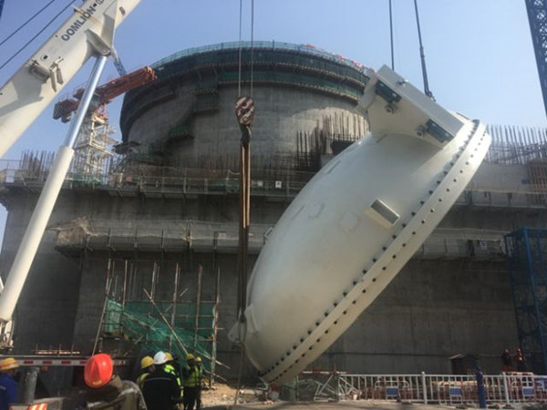 2月11日,“华龙一号”示范工程福清核电6号机组反应堆厂房(6RX)设备闸门封头吊装就位于存储支架上。
