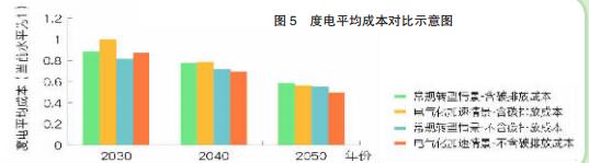 当前至2030年,电力需求保持较快增长,且新能源发电等新技术仍处于发展期,电力系统总成本持续上升。2030~2050年,电力需求增长逐渐趋于饱和,新能源发电等技术日益成熟,系统成本进入下降期,此阶段能源发展的低碳性目标与经济性目标逐渐重合。相比于电力系统总成本,度电平均成本的达峰时间更早,预计2050年度电成本约为当前水平的一半左右。