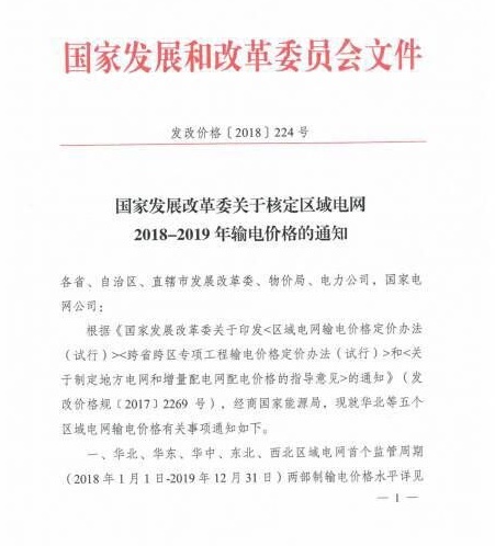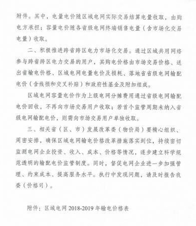 2018年2月,国家发展改革委印发了《关于核定区域电网2018—2019年输电价格的通知》(发改价格[2018]224号),规定了华北、华东、华中、东北、西北区域电网首个监管周期(2018年1月1日—2019年12月31日)两部制输电价格水平,其中:电量电价随区域电网实际交易结算电量收取,由购电方承担;容量电价随各省级电网终端销售电量(含市场化交易电量)收取。西北区域电网中,新疆电量电价为0.02元/千瓦时,容量电价为0.0014元/千瓦时。区域电网容量电价作为上级电网分摊费用通过省级电网输配电价回收,不再向市场交易用户收取;若首个监管周期未纳入省级电网输配电价,则需向市场交易用户单独收取。