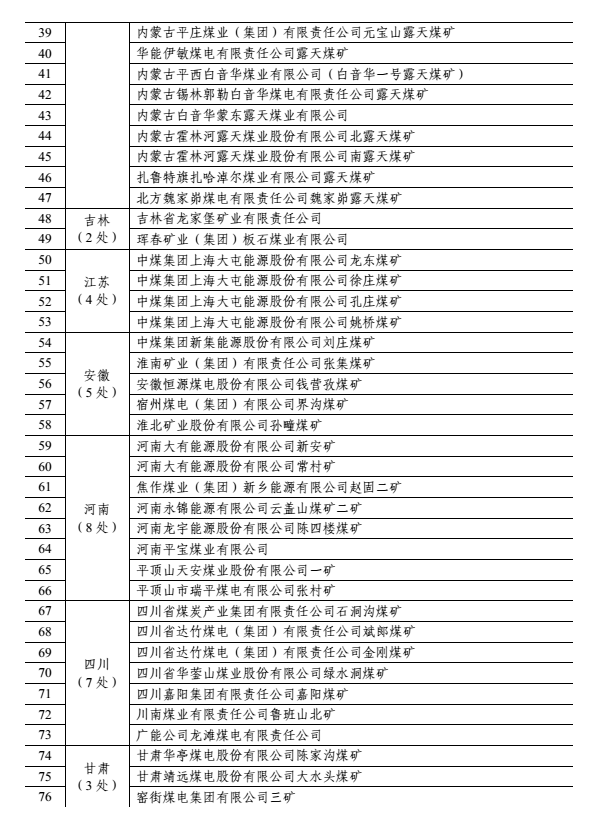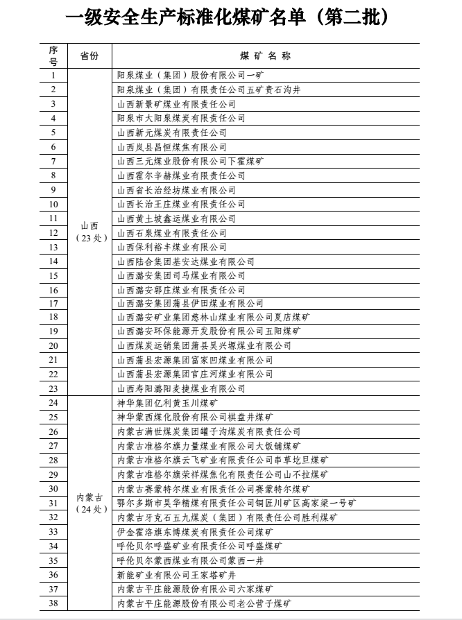 通知指出,按照《煤矿安全生产标准化考核定级办法(试行)》规定,经资料审查、现场检查、网上公示,确认阳泉煤业(集团)股份有限公司一矿等76处煤矿为一级安全生产标准化煤矿,自公布之日起有效期3年。据通知,76处煤矿包括山西23处、内蒙古24处、吉林2处、江苏4处、安徽5处、河南8处、四川7处、甘肃3处。