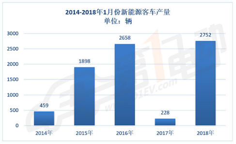 中国新能源客车2018年首月取得开门红。据工信部合格证产量统计,新能源客车2018年1月共生产2752辆,同比暴增11倍,这也是新能源汽车推广以来,开年产量最高的月份。