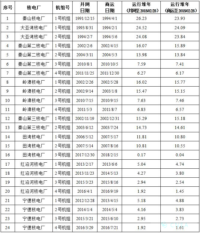 根据中国核能行业协会核电运营信息网(CINNO)统计,目前,我国共有商业运行核电机组38台(不含台湾地区),截至2018年2月28日运行堆年为279.13年,详情见下表。