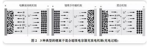 有机体系锂离子混合超级电容器3种典型的充放电机制, 并根据不同的电极材料来分析各个体系的特点和近年来电极材料的研究进展。