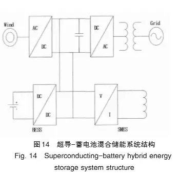 目前研究较多的SMES混合储能主要是超导-蓄电池混合储能。超导-蓄电池混合储能是将SMES与电池储能系统(batteryenergystoragesystem,BESS)相结合的一种混合储能装置。它采用共直流母线的结构,风机通过变流器和变压器连接到电网,SMES和BESS通过各自的DC/DC斩波器连接到直流母线上(图14)。