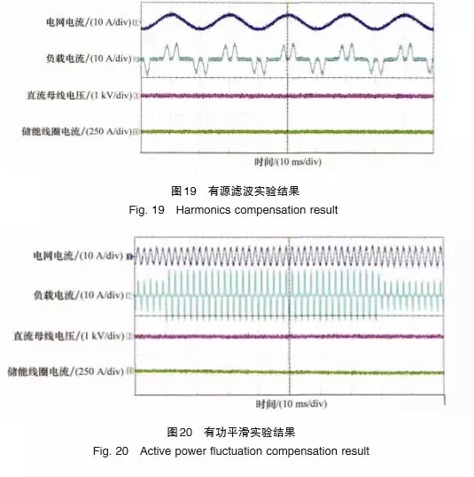 为了评估该SMES的性能,对其进行了实验和并网测试。图19是其有源滤波的实验波形,自上至下依次为电网电流、负载电流、直流母线电压和储能线圈电流。