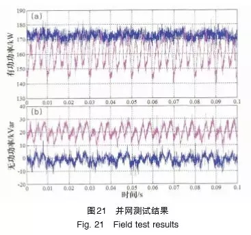图20是有功平滑的实验结果。在实验过程中,非线性负载的功率由50kW跳变到100kW后跳变回50kW。在负荷突增时,储能线圈的电流从300A下降到260A,从而为突增的负荷提供突变的有功功率;而在负荷突降时,储能线圈从电网吸收有功功率,储能线圈的电流逐渐增加到300A。在负荷突增或者突降时,电网电流的幅值没有明显变化,这表明负荷突变对电网的冲击大大减轻,有效地实现了有功平滑的功能。