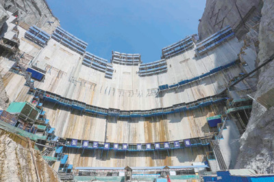 近日,乌东德水电站大坝开启浇筑不到一年突破百米大关,迎来新年开门红。乌东德水电站大坝最大坝高270米,2017年3月启动首仓混凝土浇筑,浇筑总量约280万立方米,计划2020年6月浇筑到顶。图为大坝浇筑现场 。