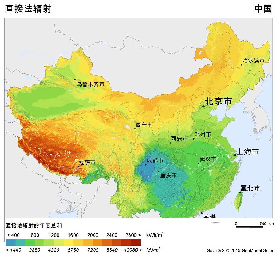 图:中国太阳直接法向辐射DNI分布(Solargis)