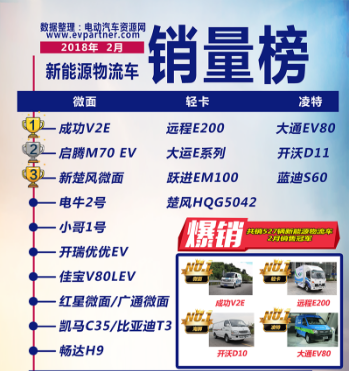 从车型来看,2月份微面市场排名前三的有成功V2E、启腾M70EV和新楚风微面,其他车型销量并不高。2月海狮市场,有三款车型,分别为开沃D10、金旅电动海狮冷藏车和东风海狮。2月轻卡市场,只有五款车型,分别为远程E200、大运E系列、跃进EM100、雅俊CTT5040和楚风HQG5042电动轻卡,销售冠军为远程E200。2月凌特市场中,只有3款车型有销量,分别为大通EV80、开沃D11和蓝迪S60。