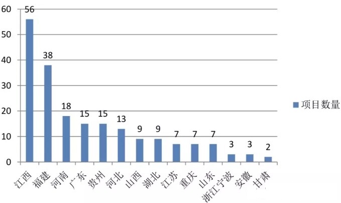 在项目数量上,江西和福建项目最多,分别为56个和38个项目。安徽和甘肃最少分别只有3个和2个。