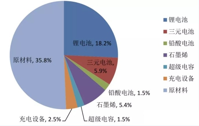 在电池材料项目中与原材料相关的项目最多,占到总数的35.8%;其次锂电池和三元电池项目分别占到项目总数的18.2%和5.9%;铅酸电池的项目很少,仅占到1.5%。这表明铅酸电池将逐渐被锂电池、三元电池所替代。另外,石墨烯项目占到了项目总数的5.4%,这显示了新材料将逐渐应用到电池的制造中。