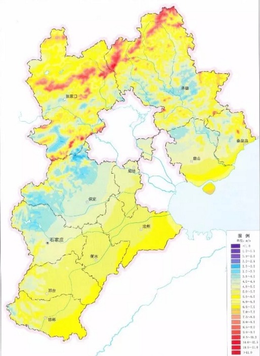 河北省属于我国风能资源丰富省份之一,主要分布在张家口、承德坝上地区,秦皇岛、唐山、沧州沿海地区以及太行山、燕山山区,其中张家口坝上地区和唐山、沧州沿海地区为百万千瓦级风电基地。风速的年变化均以冬春季最大,秋季次之,夏季最小,冬夏风向有明显的季节转换,主导风向根据区域不同有所差异。