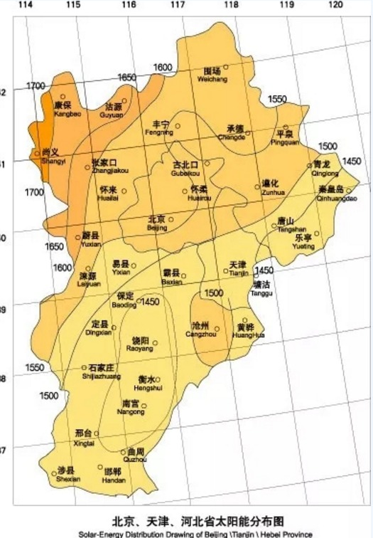 河北省全境在“很丰富带”,由南向北递增,张家口、承德一带资源条件最好,在1500kWh/m2以上其中西北(康保、尚义、沽源)最高,在1600kWh/m2以上。全省可开发量约9000万千瓦,北部张家口、承德地区年日照小时数平均为3000~3200小时,中东部地区为2200~3000小时,分别为太阳能资源二类和三类地区,具备地面电站、农光互补、光电建筑一体化等多种形式的开发条件,有较大的开发利用潜力。