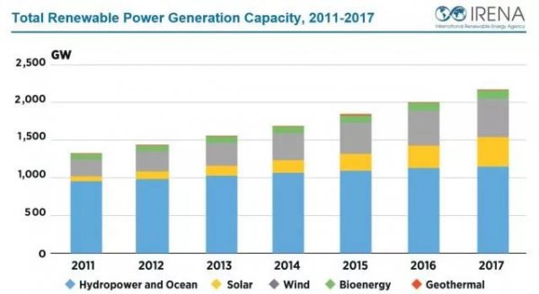 国际可再生能源机构(IRENA)发布的新数据显示,2017年全球可再生能源发电容量增加167GW,达到2179GW。 这意味着一年约增长8.3%。