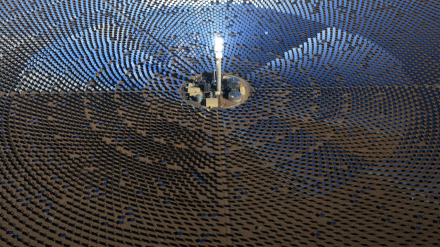 该场域将会铺满12,000面镜子,利用镜子聚集太阳光至中央220米的高塔,其内部熔盐(moltensalt)将加热到摄氏565度,并利用热交换器(heatexchanger)将热能转移至水中产生蒸气,可用于蓄热或是用蒸气来驱动发电机。