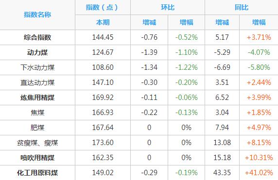 2018年4月9日,第244期中国太原煤炭综合交易价格指数为144.45点,环比下跌0.52%。其中:动力煤指数124.67点,环比下跌1.10%;炼焦用精煤指数169.92点,环比下跌0.06%;喷吹用精煤指数162.35点,环比持平;化工用原料煤指数149.02点,环比下跌0.19%。