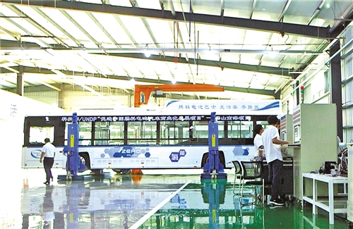 位于佛山南海丹灶镇的泰罗斯公司员工在对燃料电池大巴进行检测。 记者 庞彩霞摄