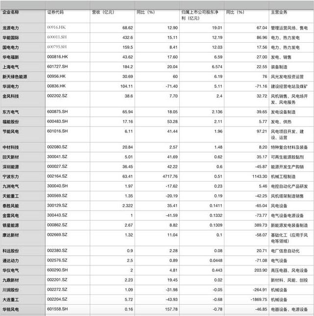 通过梳理,单从净利润情况来看,净利润排名靠前的风电概念上市公司的主营业务多为风力发电、风场运营管理等。从事风力设备制造企业聚集于表格的中下游,这意味着上游风电机组或配件制造商的利润略逊于下游风电运营商。