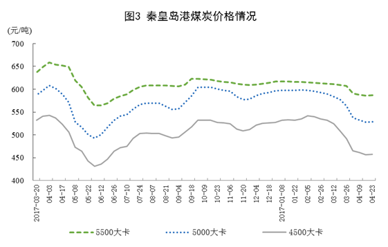 煤炭价格有所下跌。截至4月底,秦皇岛5500大卡煤炭平仓价为每吨587元,比3月底下降20元;5000大卡每吨529元,下降35元;4500大卡每吨457元,下降34元。