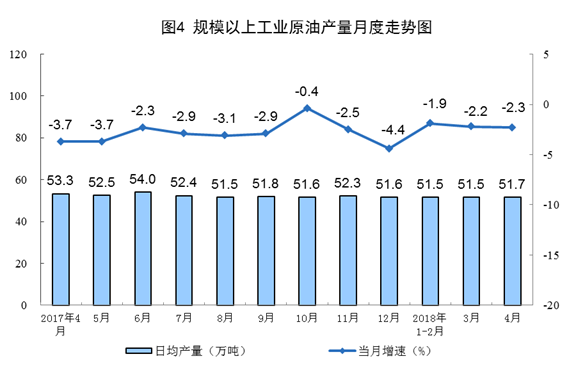4月份,原油生产1551万吨,同比下降2.3%,降幅比上月扩大0.1个百分点;日均产量51.7万吨,比上月增加0.2万吨。