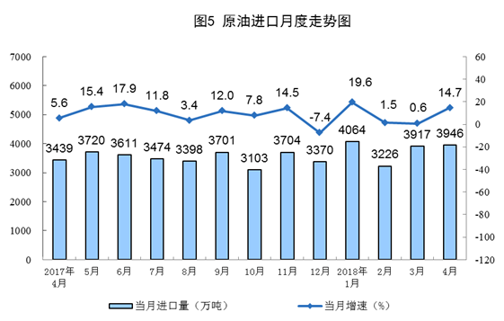 4月份,原油进口大幅增长,进口3946万吨,同比增长14.7%,增速比上月加快14.1个百分点;日均进口131.5万吨,再创历史新高。1-4月份,进口原油1.5亿吨,同比增长8.9%。