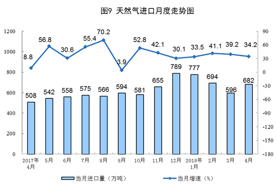 天然气进口连续7个月保持30%以上的高速增长。4月份,天然气进口682万吨,同比增长34.2%,增速比上月回落5个百分点。1-4月份,进口天然气2742万吨,同比增长36.4%。