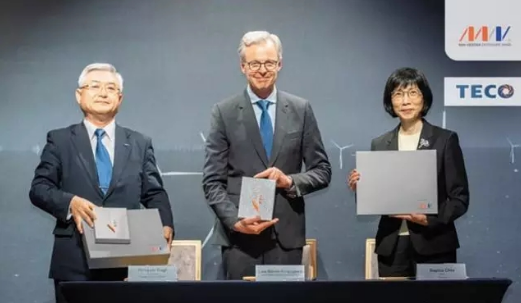 三菱重工维斯塔斯为加速海上风电供应链在地化,3月底与台塑、上纬、天力及中钢机械等4家公司签合作备忘录,昨日由共同执行长Lars Bondo Krogsgaard与东元集团董事长邱纯枝、芬兰斯维奇日籍取缔役扇博幸共同签署海上风机的新一代永磁发电机合作备忘录。
