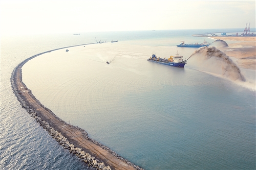 科伦坡港口城项目是中国与斯里兰卡在“一带一路”建设中的重点合作项目,由斯里兰卡政府和中国港湾科伦坡港口城有限责任公司联合开发,于2014年9月动工,整体开发时间约25年。图为吹沙船在科伦坡港口城项目上进行疏浚吹填作业。(图片来源:新华社)