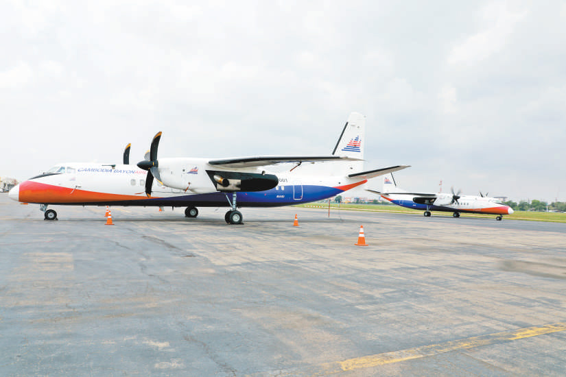 巴戎航空公司的两架新舟60客机停靠在金边国际机场。(图片来源:人民日报 赵益普摄)