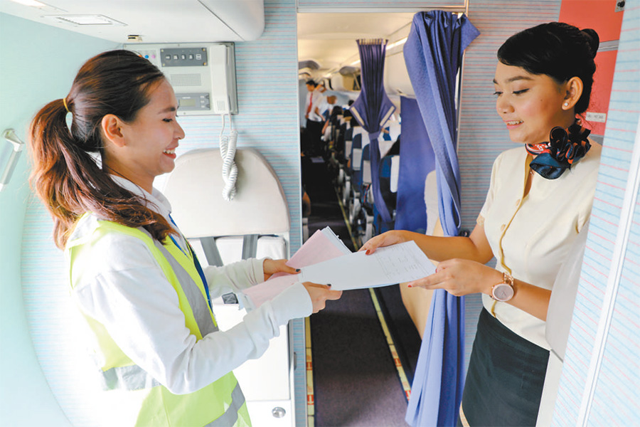 金边国际机场,在一架即将飞往暹粒的新舟60客机上,巴戎航空公司的工作人员正在交接资料表格。(图片来源:人民日报 赵益普摄)