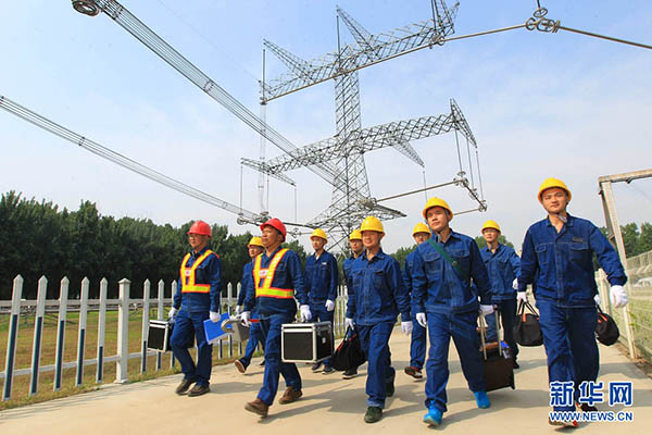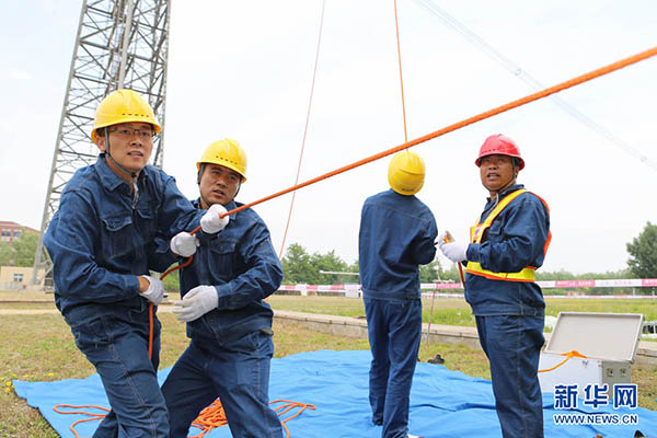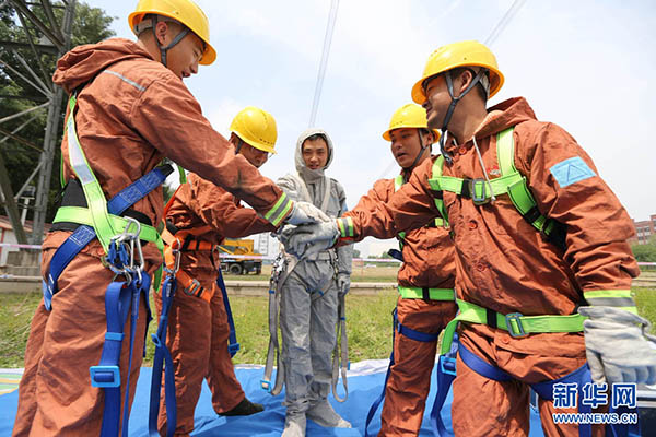 5月19日,在中国电科院特高压试验基地,带电作业人员登塔前相互加油鼓劲。