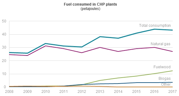 2017年,拉脱维亚热电联产电厂主要消耗天然气(27.1焦耳(PJ))和薪材(12.4 PJ)。在2008年至2017年期间,热电联产工厂消耗的天然气份额从94%下降到接近63%,而RES消耗的份额增长了33个百分点,2017年达到37%。