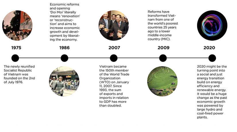 2015年,在COP21开始在巴黎之前的几天,越南总理宣布了可再生能源战略(RES)。经修订的国家电力发展总体规划(PDPVII修订版)也反映了RES的目标。在这个过程中,新建燃煤电厂的容量为20吉瓦,相当于约17座不会建成的燃煤电厂,并且可再生能源目标大幅增加。越南新建的其他火电厂数量的减少导致温室气体减排量相当于每年在道路上减少3200万辆汽车。越南政府也将2030年的能源需求预测下调18%。根据修订后的PDPVII,越南电力总产量中超过10%现在计划从2030年的可再生能源发电。在2016年后期,越南决定不分阶段投入核能,并停止为总装机容量为4000兆瓦的两座核电厂进行准备。这种能力差距为增加更多的太阳能和风能提供了机会。