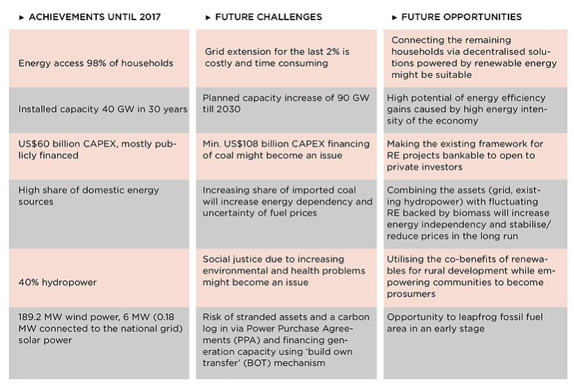 2030年,可再生能源解决方案(不包括大型水电)将只提供高达10%的装机容量的少量份额。由于温室气体排放量较低,越南在理论上有一个跨越式的机会窗口化石燃料投资和体验相对无痛的过渡。为了避免将国家锁定在化石燃料结构中的道路,伴随着越来越多的滞留资产以及更高的能源依赖性,需要政治意愿。为了加速可再生能源的潜力并开始侧重于可再生能源的共同效益的社会和公正的能源转型,需要开发化石燃料和可再生能源发电的公平竞争。