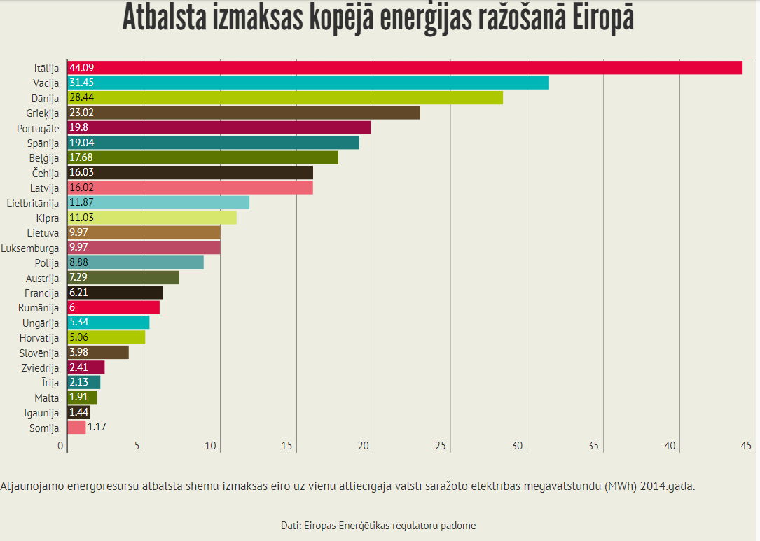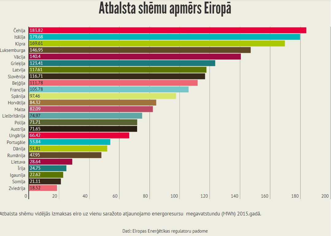 欧洲能源监管委员会(CEER)去年完成了一项关于欧洲支持机制的重要研究。对2014年和2015年的数据进行了分析,总体结论是:援助计划为欧洲电力消费者带来巨大成本。欧洲绿色能源生产商在2015年收到的超过批发价格的平均成本为每兆瓦时110欧元(MWh)。最高的付款是在捷克共和国,意大利和塞浦路斯。在拉脱维亚,支付额也超过了欧洲的平均水平。反过来,最低温室气体补充剂在瑞典。